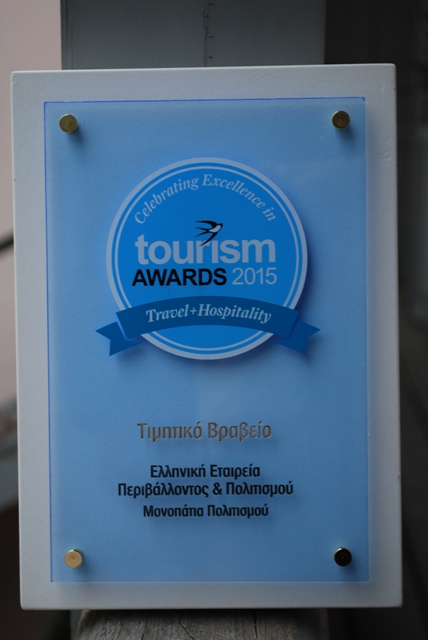 Το πρόγραμμα «Μονοπάτια Πολιτισμού» της ΕΛΛΗΝΙΚΗΣ ΕΤΑΙΡΕΙΑΣ Περιβάλλοντος και Πολιτισμού δέχθηκε Τιμητικό Βραβείο στα πλαίσια της Τελετής Απονομής των Tourism Awards 2015, την Πέμπτη 12 Μαρτίου, στο Μέγαρο Μουσικής Αθηνών.